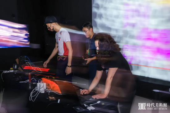 展览开幕式当晚,一场现代舞融合电子乐的跨界艺术派对也在北京时代美术馆发生。舞者做为现实生活中所有观众的缩影,从具象且熟悉的现实生活,初触数字世界的多元,并在数字世界探寻,用丰富的声音元素丰满数字世界的音乐和视角,舞者在艺术作品中狂欢。高速的跳舞节奏在美术馆空间中无序碰撞,伴随VJ的现场创作,为展览带来一股强烈暗能,呈现艺术跨界融合最奇妙的景观。