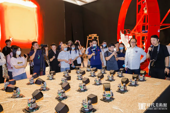 此次开幕式现场还举行了“2021亚洲数字艺术展”全球作品征集的颁奖仪式,奖项包含艺术奖、科技奖、U19奖(19岁以下),以及“亚洲数字艺术大奖”。“今年2021亚洲数字艺术展采用特邀作品加征稿的模式,结果令人欣喜。投稿来源遍布全球各地,投稿者上至年逾花甲的老艺术家下至十几岁的少年,其教育背景则溢出了艺术领域。可以说数字艺术已经不再是一种先锋尝试,而是成为很多人的日常书写方式,乃至是他们体验这个新世界的基本方式。”策展人邱志杰说。开幕及颁奖仪式结束后,策展人邱志杰及艺术家还在现场为观众们进行了展览导览。