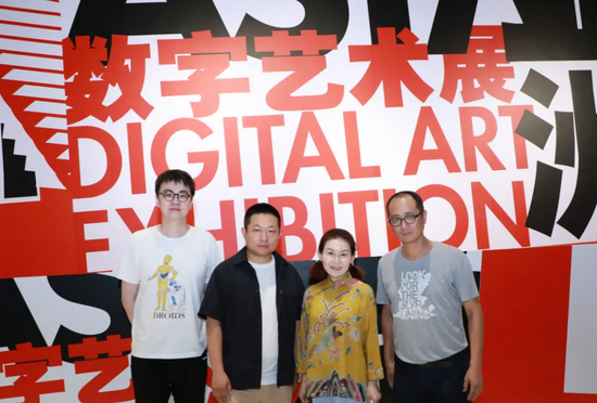 从左至右:展览策展人陈抱阳、亚洲数字艺术展出品人王鹏、华熙国际投资集团董事长兼北京时代美术馆馆长赵燕及策展人邱志杰合影